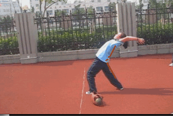 3、预摆 预摆是为最后用力提高实心球的初速度创造良好条件,预摆次数因人而定,一般是一至二次,当最后一次预摆时,此时球依次是从前下方经过胸前至头后上方,加速球的摆速,此时上体后仰,身体形成反弓形,同时吸气。