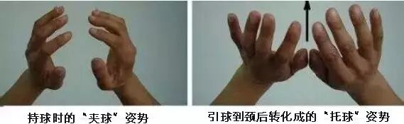 “八”字,以保持球的稳定握球后,两手下垂自然置于身体前下方,这样可以节省力量,在预摆时增大摆动幅度握球和持球时应注意:①球应握稳,两臂肌肉放松;②在动作过程中能控制好球并有利于充分发挥两臂、手指和手腕的力量。