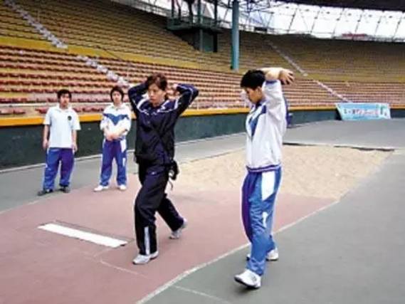 2、预备姿势 两脚前后开立,前脚掌离起掷线约20-30厘米,前后脚距离约一脚掌,左右脚间距离半脚掌,后脚脚跟稍微离地,两手持球自然,身体肌肉放松,重心落在两脚中间偏前,眼睛看前上方,然后再抛出