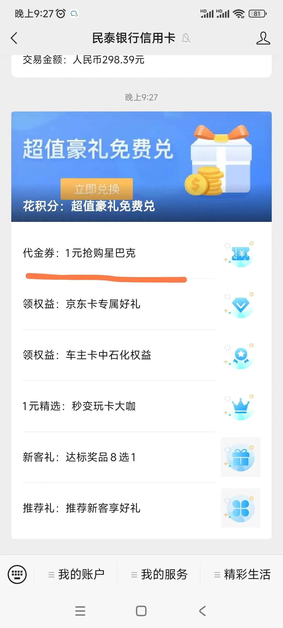 4、缺点就是每天要冲很多笔,我有3个账号,相当于要冲30次; 5、除了以上活动之外,民泰银行官微还有其他活动,精彩活动~~信用卡权益~~代金券:1元抢购星巴克;