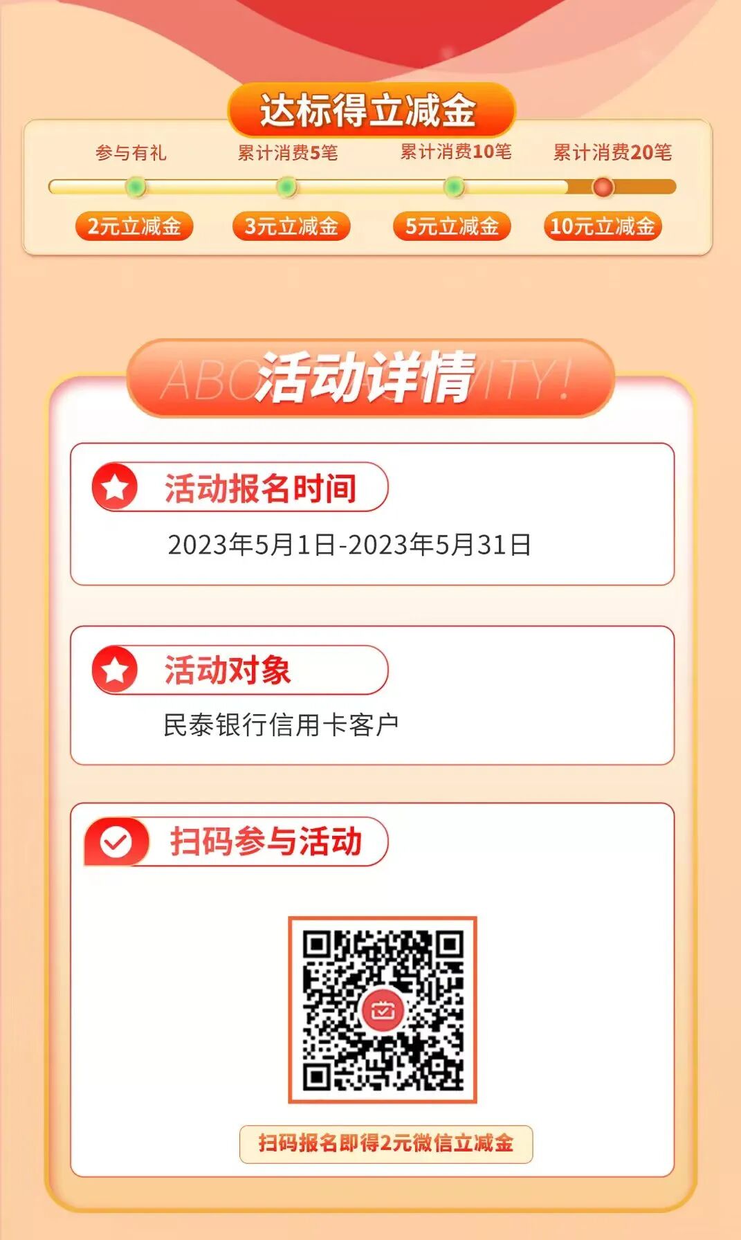这张卡就是“民泰银行信用卡”你有吗?一、活动时间2023年5月1日-2023年5月31日二、活动对象民泰银行信用卡客户三、活动攻略 1、扫码参与20元微信立减金活动,第一次直接领2元,后面需要通过刷卡完成任务;