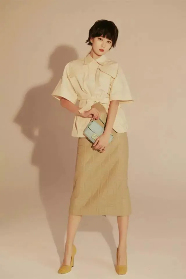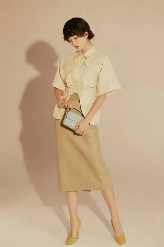 米黄色一直是简约风格的标配,米黄色的衬衫质感十分服帖宽松,上面的大口袋设计十分干净利落不知道大家有没有发现,乔欣经常会穿米色这一系列的搭配,这也是她清纯气质的一个重要原因Look2.裙装比例也很完美