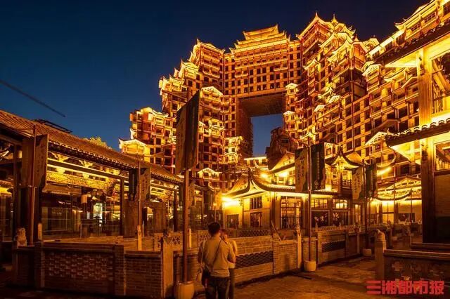 七十二奇楼是土风国潮的主题景区,拥有162铺特色小吃、1001间主题房,还有酒吧街、作坊街、博物馆等多种休闲业态。每当夜幕降临,景区门口的蜿蜒长队,成为夜色张家界的一道靓丽风景。