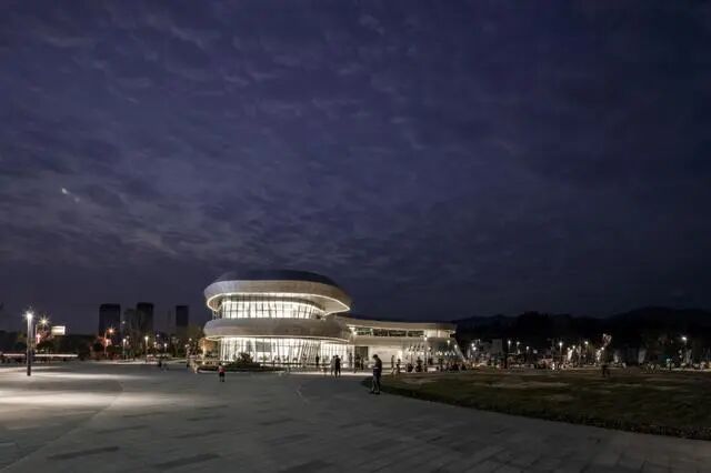 建筑整体形态似大鲵昂头,倾斜的屋面在头部位置向外悬挑7m,二层的灰空间既形成室外观景平台,供游客休憩远眺,又能避免生硬地添加“雨篷”对建筑形体连贯性的破坏同时,檐下空间的设计也使得建筑室内外融为一体